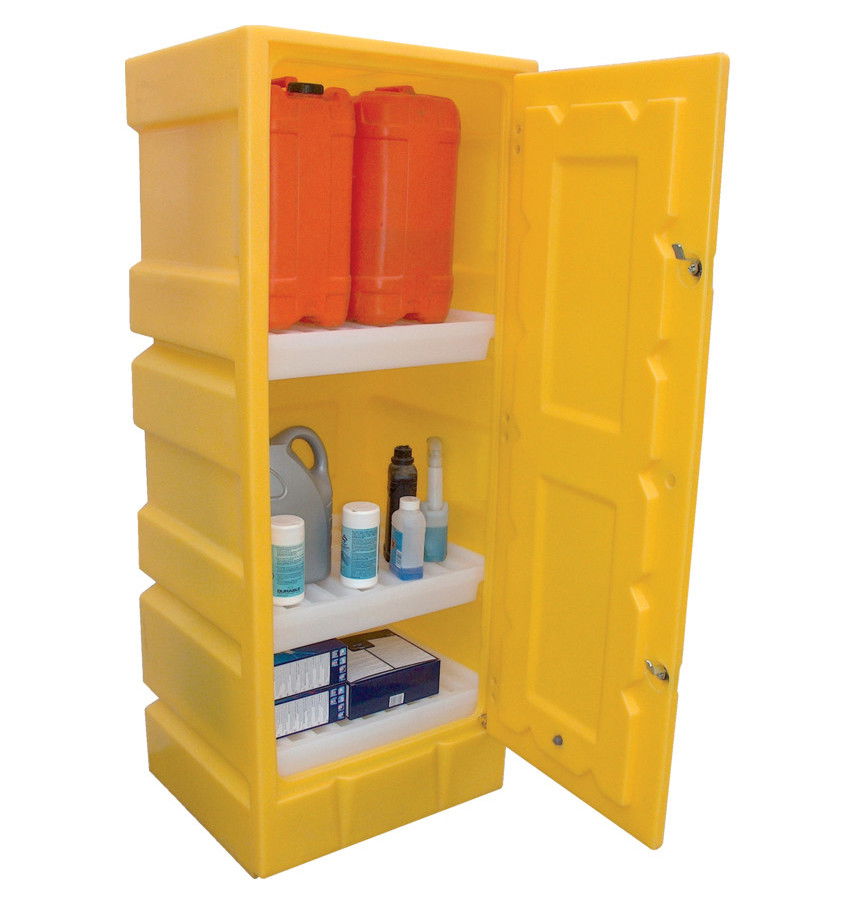 - Zárható műanyag tárolószekrény polcokkal.