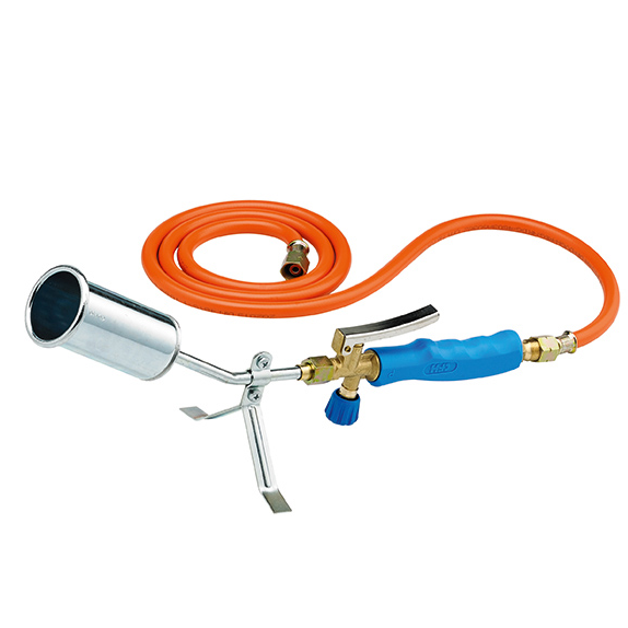 • Különösen kézreálló, nagy teljesítményű felmelegítő- és leperzselőkészülék rövid csővel és 50 mm átmérőjű speciális égővel.